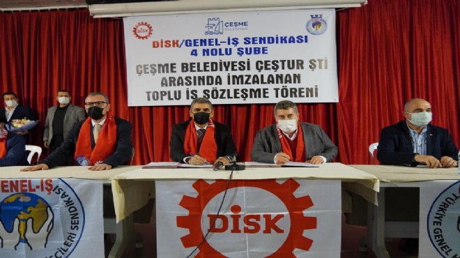 Çeşme Belediyesi ve DİSK/Genel-İş Sendikası 4 Nolu Şubesi arasında belediyede görev yapan 330 personeli kapsayan Toplu İş Sözleşmesi imzalandı. Çakabey Kültür Merkezi’nde Toplu İş Sözleşme töreni gerçekleştirildi. Çeşme Belediye Başkanı M. Ekrem Oran ve DİSK / Genel İş Sendikası Genel Başkanı Remzi Çalışkan arasında imzalanan 2 yıl süreli sözleşmeyle işçilerin taban ücretlerine zam yapıldı.