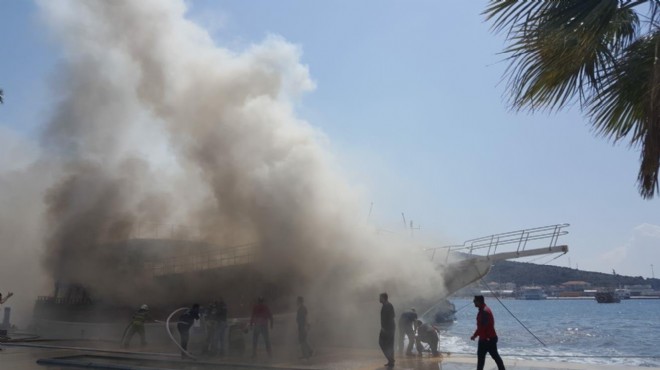 Çeşme ilçesinden Eşek Adası'na günübirlik turlar düzenlenen 'Lady Bente' isimli gezi teknesinde saat 14.00 sıralarında, kıyıda bağlı olduğu sırada henüz belirlenemeyen nedenle yangın çıktı.