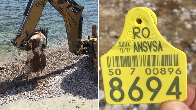 Gemilerle yurtdışından getirtilen ve bir limanda indirilme esnasında gemiden düşme ihtimali düşünülen ineğin Çeşme Belediyesi ekiplerince iş makinesi yardımıyla denizden çıkarılarak gömülüp imha edildi.