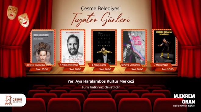Kültür sanat alanında yaptığı çalışmalarla fark yaratan Çeşme Belediyesi tiyatroseverleri bir dizi tiyatro ile buluşturuyor. Çeşme Belediye Başkanı M. Ekrem Oran, tüm sanatseverleri Çeşme Aya Haralambos Kilisesi’nde gerçekleşecek Çeşme Tiyatro Günleri’ne davet etti.
