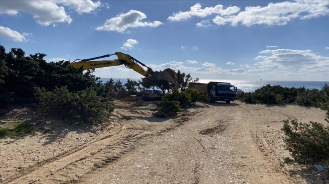 Çeşme Belediyesi zabıtası, kumsal yapmak için denize yakın alanı kiralayan özel bir şirketin, alan açmak için ardıç ağaçlarını kesmesi üzerine tutanak tuttu.