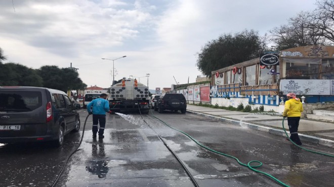 Çeşme Belediyesi Koronavirüs salgınına karşı önlem çalışmalarını, yoğun ve sistemli şekilde sürdürüyor. Çeşme Belediyesi koronavirüs tedbirleri kapsamında, ilçe genelindeki cadde ve sokakları solüsyonlu su yıkayarak, çöp konteynerlerini dezenfekte ediyor.