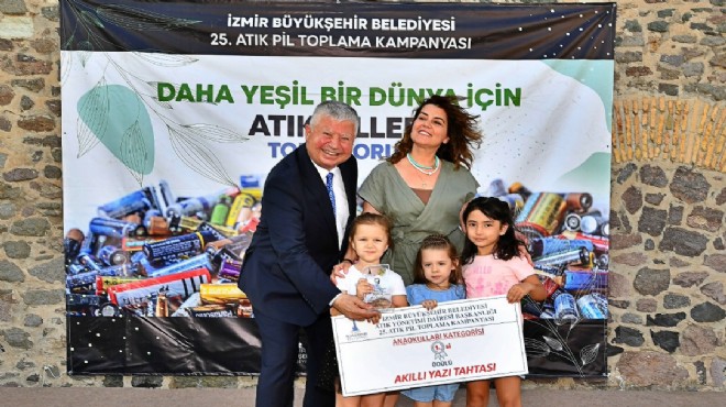 İzmir Büyükşehir Belediye Başkanı Tunç Soyer’in “Gelecek kuşaklara daha yaşanabilir bir dünya bırakma” hedefi doğrultusunda sürdürülen atık pil toplama kampanyasının ödülleri sahiplerini buldu. Bu yıl 25'incisi düzenlenen kampanyada çocuklar, gençler, yetişkinler, anaokulları, okullar, muhtarlıklar, ilçe belediyeleri, Bizim Ev Aile Çocuk Gençlik Destek Merkezi olmak üzere 8 kategoride ödüller verildi. Kazananlar ödüllerini Alsancak Tarihi Havagazı Fabrikası’nda düzenlenen törenle İzmir Büyükşehir Belediyesi Başkan Vekili Mustafa Özuslu’nun elinden aldı.