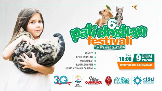 Çiğli Belediyesi Veteriner İşleri Müdürlüğü'nce organize edilecek 6. Pati Dostları Festivali 9 Ekim Pazar günü Akvaryum Kafe Restoran’da düzenlenecek. Festivalde konser, tiyatro gösterimi, spor oyunları ve çeşitli yarışmaların yanı sıra sahiplendirme ve ücretsiz mama dağıtımı da yapılacak. Etkinlik saat 16:00'da başlayacak ve ücretsiz olacak.