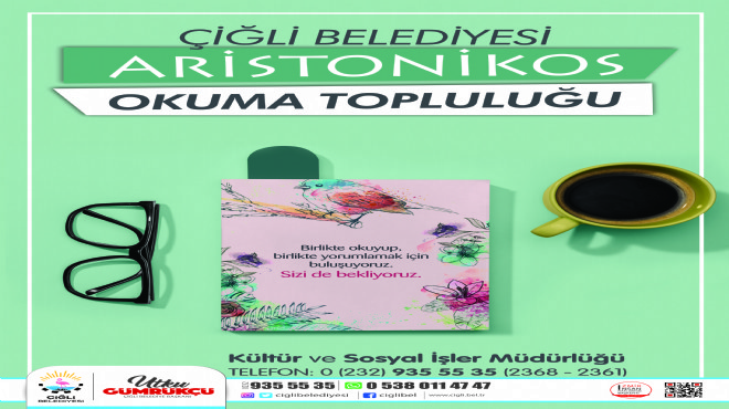 ?Kültür ve Sosyal İşler Müdürlüğü'nün organize ettiği tanışma toplantısı, Pandemi koşulları nedeniyle online olarak gerçekleştirildi. Toplantıya, hali hazırda Çiğli Belediyesi Meclis Üyeliği görevini sürdüren eski Kültür Bakanı Suat Çağlayan, yazar Osman Akbaşak ve kitapseverler katılım gösterdi.Tanışma faslının ardından topluluğun kuruluş amacı ve hedeflerinin konuşulduğu toplantıda,ilk olarak eski Kültür Bakanı Suat Çağlayan’ın kaleme aldığı “Umutlar Yarım Kaldı Aristonikos” kitabının okunması kararlaştırıldı. Okuma sonrası tekrar bir araya gelinerek kitap ve edebiyat üzerine söyleşi yapılacağı belirtildi.