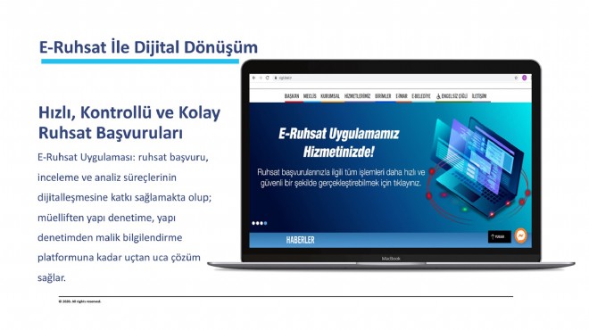 E-Ruhsat uygulaması ile ruhsat başvuru, inceleme ve analiz süreçleri dijitalleştirilerek proje hazırlama, yapı denetim ve malik bilgilendirme aşamaları uçtan uça internet teknolojisiyle zamandan, iş gücünden ve kağıt tüketiminden tasarruf edilerek gerçekleştirilecek. Uygulamanın kullanımını güçlendirmek amacıyla MIS, EBYS, dijital arşiv, e-imza, e-devlet, SMS ve mail platformlarıyla entegrasyonu sağlanacak. Raporlama tekniği kullanılarak iş yükünü yönetme ve iş atama konularında özgün ve yenilikçi stratejiler geliştirilecek.