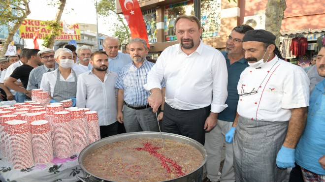Muharrem Ayı’nın anlam ve önemine dair yapılan konuşmaların ardından Başkan Utku Gümrükçü, dev kazanların başına geçerek vatandaşa aşure dağıttı.
