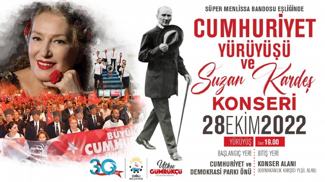 Çiğli Belediyesi’nin 29 Ekim Cumhuriyet Bayramı kapsamında hazırlıklarını tamamladığı etkinlikler, 25 Kasım Salı günü Akvaryum Kafe Restoran’da ilçe protokolünün katılımıyla gerçekleştirilecek “Cumhuriyet Resepsiyonu” ile başlayacak. Aynı gün Atatürk Spor Salonu’nda Masa Tenisi Turnuvası düzenlenecek. 26 Ekim Çarşamba günü Kasaplar Meydanı’nda Cumhuriyet Kermesi kurulacak. Kermeste Çiğli’nin emektar kadınlarının el emeğiyle ürettikleri ürünlerin satışı yapılacak. Saat 13:00’de ise Kasaplar Meydanı’nda Tavla ve Dama Turnuvası düzenlenecek. 27 Ekim Perşembe günü Çiğli Belediyesi Fakir Baykurt Salonu’nda “Seni Anlatabilmek” isimli tiyatro oyunu sahnelenecek. Kutlamalar 28 Ekim Cuma günü Süper Menlissa Bandosu eşliğinde gerçekleştirilecek Cumhuriyet Yürüyüşü ile devam edecek. Cumhuriyet ve Demokrasi Parkı önünden başlayacak yürüyüşün bitiş noktasında sanatçı Suzan Kardeş, Türk müziğinin sevilen şarkılarını Çiğlililer ile birlikte seslendirecek.