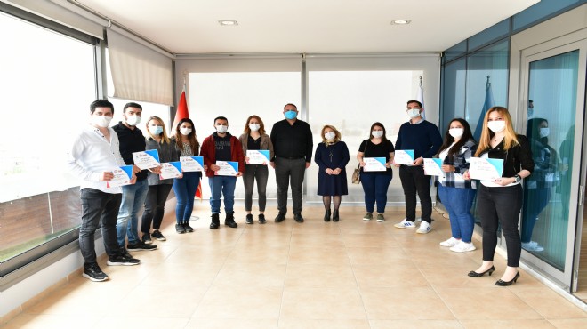 Çiğli Belediye Başkanı Utku Gümrükçü ve İzmir Eczacı Odası Çiğli Bölge Sorumlusu Pakize Akgün pandemi nedeniyle sadece başarılı olan ilk on kursiyere sertifikalarını verdi.