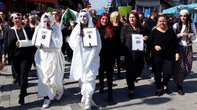 Şiddette uğrayan kadınları temsilen makyaj ile dövülmüş görüntüsü verilen kadınlar Çiğli sokaklarında tabut ve kefenle yürüdü.