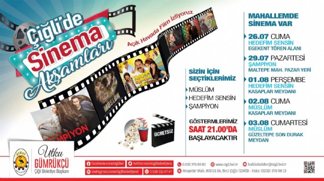 Çiğli Belediye Başkanı Utku Gümrükçü, sinemaya gitme fırsatı bulamayanlar için “Mahallemde sinema” etkinliği yaparak, vatandaşı sokaklara çıkaracaklarını söyledi. Çiğlili sinemaseverlerin, aileleri ve sevdikleriyle beraber keyifli vakit geçirme imkanı bulacağı bu etkinliğe halkı davet eden Başkan Gümrükçü, “Sıcak yaz akşamları için keyifli bir sinema etkinliği düzenledik. Son dönem filmlerini gösterime sunacağız. Ailelerimizin çocuklarıyla birlikte gelerek keyifli vakit geçirmelerini istiyoruz” dedi.