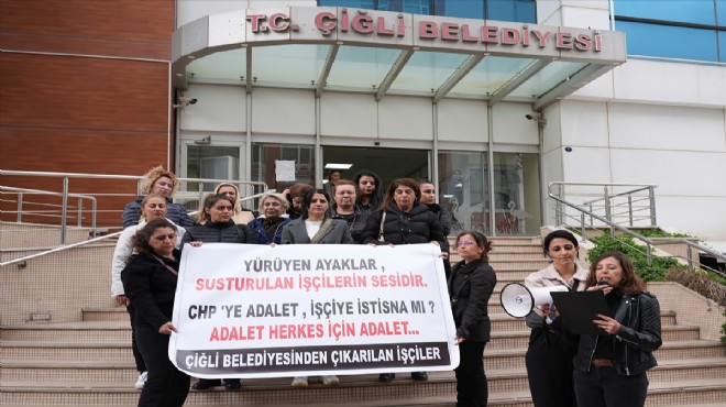 Çiğli Belediyesi önünde toplanan işçiler, "Yürüyen ayaklar susturulan işçilerin sesidir", "CHP'ye adalet, işçiye istisna mı?", "Adalet herkes için adalet" yazılı pankart açtı, slogan attı.