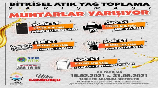 Çiğli Belediyesi tarafından, atık yağların doğaya karışmadan geri dönüşüme kazandırılması amacıyla muhtarlar arası ödüllü “Bitkisel Atık Yağ Toplama Yarışması” başlatıldı.