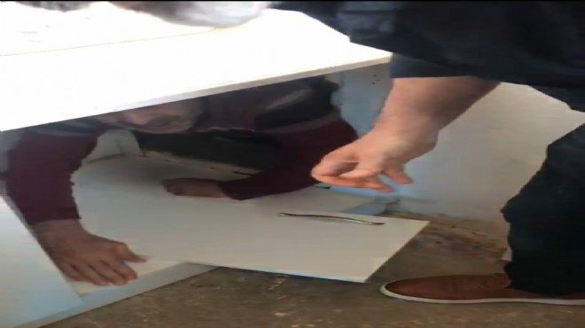 E.V.'nin, mutfak dolabından girilen, gizli bir bölme oluşturması polisleri de şaşırttı. Gözaltına alınan şüphelinin polisteki işlemlerinin sürdüğü bildirildi. (DHA)