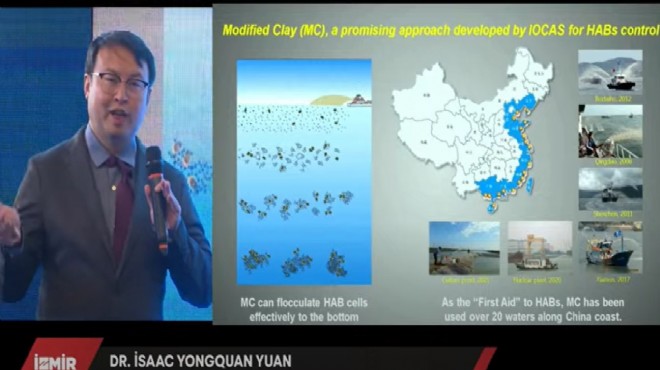 Yuan şöyle konuştu: Çin’de modifiye edilmiş kil program ile ilgili projeden bahsetmek istiyorum. Deniz yüzeyinde algler insanlara zarar verecek durumlar olduğundan bahsediyoruz. Dünyanın birçok yerinde alglardan dolayı birçok insan hayatını kaybetti. Bunu bir deniz felaketi olarak tanımlayabiliriz. Bu durumun çok acil bir şekilde çözülmesi gerekiyor. Bu konuda birçok metot bulunmakta. Bunula ilgili saha çalışmalarından bahsetmemiz gerekiyor. Fiziksel tedbirlerden bahsediyoruz. Fiziksel önemler alınarak, bu sorun çözülebilir. Buradaki alglerin İzmir’de kilometrelerce deniz yüzeyine yayılmasından bahsediyoruz. Burada kil metodu ile birlikte ultrasonik önemler bizim işimize yarayabilir. Bunun için kimyasal önemler de alınabilir. Kimyasalların birbirinden ayrıştırma yoluyla çözümler bulabiliriz. Biyolojik önemler de alınması gerekiyor. Çin’de kullandığımız modifiye kil modeli… Killeri su yüzeyine yayıyoruz. Bu sayede su yüzünü 30 dakikada temizleyebiliriz. Burada kil parçacıkları ile hab hücreleri arasında bir etkileşimi görmeliyiz. Bu sayede yüzlerce kilometrelik alan temizlenebilir. İzmir Körfezi’nde de bu metot etkin bir şekilde kullanılabilir. Burada kirliliğin yüzde 70-80’ni 30 dakikada temizleyebiliriz. Kilometre çapında 10 tonluk kil kullanabiliriz. Yüzey etkin şekilde temizlenebilir. Bu da etkin bir mücadele ile ortaya çıkabilir. Bir diğer model su kalitesini attırabilmesi için bir takım bileşimler bulunmakta. Burada zararlı hücrelerin bölünmesi ve deniz dibine gönderilmesiyle olabilir. Bunun için bir takım değerlendirmeler var. ABD ve Şili’de değerlendirmeler yaptık. Diğer canlı organizmalara zarar vermemekte. Biz kullanışlı ekipmanlara ihtiyaç var. Bir takım tekneler aracılığıyla İzmir’de de uygulanabilir. Bu sadece Çin’de uygulanan bir metot değil. İzmir’e bir takım tavsiyeler vermek istiyoruz. İzmir’deki bir takım parametrelere bakmamız gerekiyor. Sıcaklıkla, planktonlara bakmamız gerekiyor. Politatların kirleticilerin önünü kesmemiz gerekiyor. Bunların büyük zararı var. İzmir’de MC teknolojisini kullanarak habların kontrol edeceğini söyleyebiliriz. İzmir’de kullanabilir hususları kullanılması gerekiyor. Bu noktada hab bir felaket şeklinde önümüze gelmekte. Bu hablarla aynı şekilde mücadele edilmesi gerekiyor. Kamu ve özel sektörün müşterek şekilde çalışması gerekiyor.