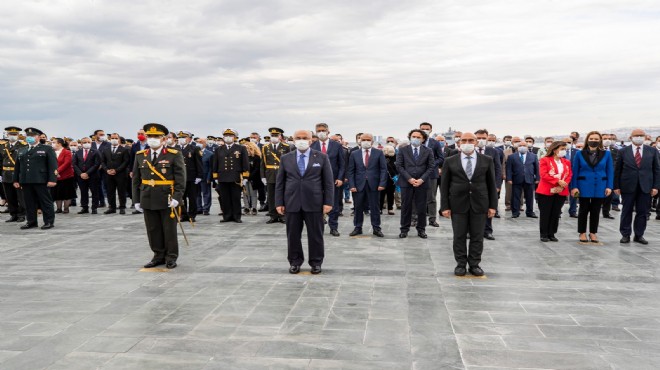 Törende Cumhuriyet Meydanı'ndaki Atatürk Anıtı'na İzmir Valiliği, Ege Ordusu ve Garnizon Komutanlığı ile İzmir Büyükşehir Belediyesi'nin çelenkleri konuldu. Tören, saygı duruşu ve İstiklal Marşı'nın ardından son buldu.