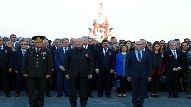 Vali Köşger, Korgeneral Yeni ve Başkan Soyer, Atatürk Anıtı'na çelenk bıraktı. Atatürk'ün hayatını kaybettiği saat olan 09.05'te 2 dakikalık saygı duruşunda bulunuldu, askeri bando eşliğinde İstiklal Marşı'nın okundu. (DHA)