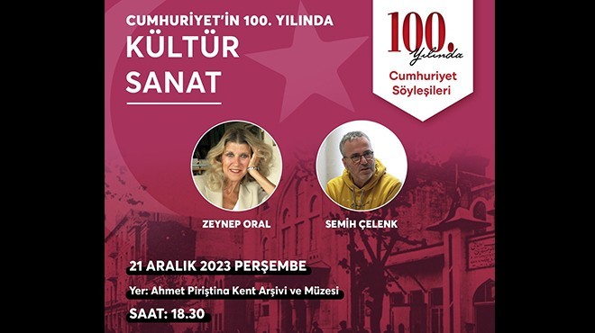 “Cumhuriyetin 100. Yılında Kültür ve Sanat” söyleşisinin konukları; Semih Çelenk ve gazeteci-yazar Zeynep Oral olacak. Söyleşide, kültür-sanat alanındaki değişim ve gelişim süreci farklı yönleriyle ele alınacak.