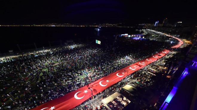 29 Ekim Pazar günü ise kutlama coşkusu sokaklara taşacak. İzmirliler saat 18.30’da Konak Pier önünden Cumhuriyet Meydanı’na kadar 350 metre uzunluğundaki dev Türk Bayrağı ile birlikte yürüyecek. Saat 19.00’da Cumhuriyet Meydanı'ndan başlayacak ve Gündoğdu Meydanı’nda son bulacak fener alayına İzmir Büyükşehir Belediye Bandosu çaldığı marşlar ile eşlik edecek. Fener alayına katılan vatandaşlara Türk Bayrağı dağıtılacak.