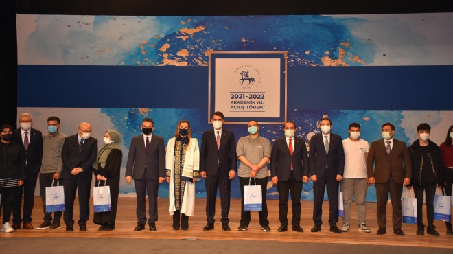 Törenin ardından Dokuz Eylül Üniversitesi'ne derece ile kaydolan öğrencilere hediyeleri verildi. (DHA)