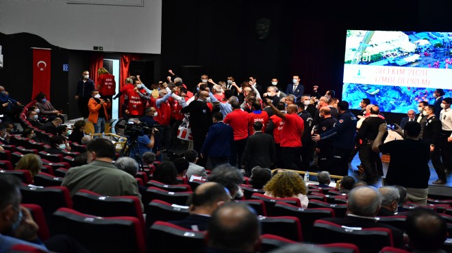 Sendika yöneticileri, “Kıdeme dokunan eller kırılsın. Hükümet yasanı al başına çal” sloganları attı. Soyer duruma müdahale etti ve “Arkadaşlar burası İzmir Büyükşehir Belediyesi salonu, lütfen salonu boşaltın” dedi.