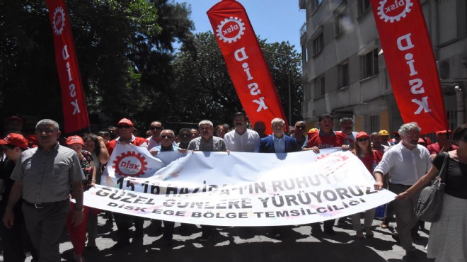 DİSK üyeleri, 15- 16 Haziran işçi eylemlerinin yıl dönümünde, yarım gün süreyle iş bıraktı. İşçilerin koşulsuz kadrolu ve güvenceli olarak istihdamının sağlanmasını isteyen DİSK üyeleri, Bornova metro durağı önünde toplandı. DİSK üyesi işçiler, Ege Üniversitesi'nde güvenlik gerekçesiyle kadro alamayan ve işten çıkarılan işçilere destek vermek için buradan Rektörlük binası önüne kadar yürüdü. '15- 16 Haziran ruhu ile güzel günlere yürüyoruz' pankartı ile yürüyen işçiler; 'İş ekmek yoksa barış da yok', 'Kadro dediniz işimizden ettiniz', 'Zafer direnen emekçinin olacak' sloganları attı. İşçilere; HDP, KESK, TMMOB üyeleri ile CHP İzmir milletvekili adayı Kani Beko da destek verdi.