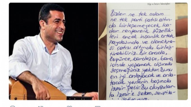 Aksünger, paylaşımında “Selahattin Demirtaş’ın Edirne’deki ziyaretimizde İzmirlilere yazdığı barış ve kardeşlik mesajı takdire şayandır” ifadelerini kullandı.