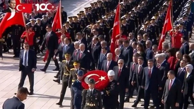 Cumhurbaşkanı Erdoğan'ın üzerinde ay yıldız bulunan çelengi Atatürk'ün mozolesine bırakmasının ardından saygı duruşunda bulunuldu ve İstiklal Marşı okundu.