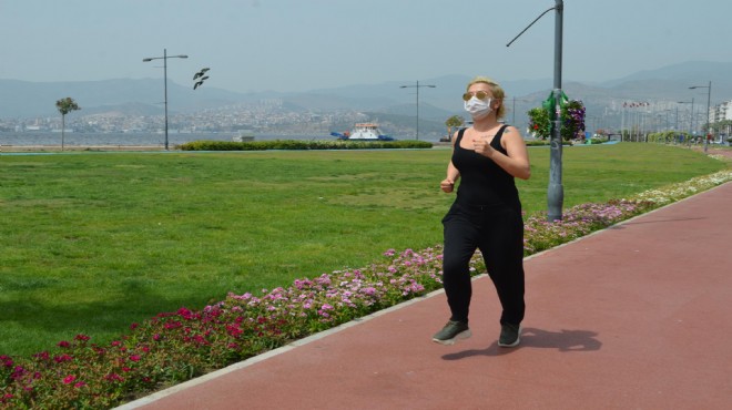 Düzenli olarak Alsancak Kordon'da spor yapan Su Karaman (37), "Düzenli olarak koşuyorum. Maskeyle koşmak çok zor oluyor. Hava da sıcak olduğu için yüzüm çok terliyor. Ama uzmanlar da maskenin çıkarılmaması gerektiğini söylüyor. Bu yüzden spor yaparken de maskemi çıkarmıyorum" dedi. (DHA)