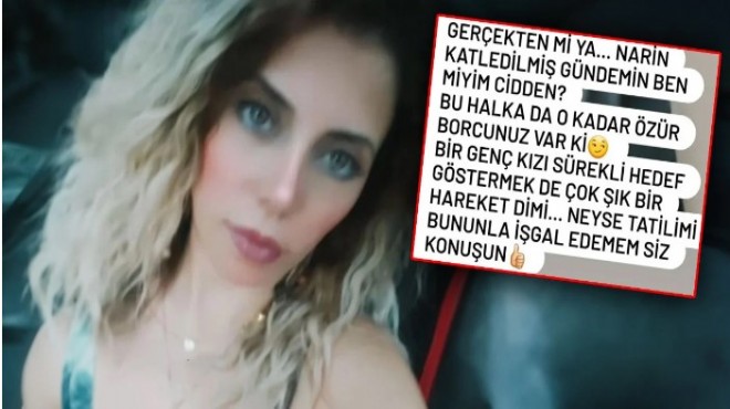 "Gerçekten mi ya... Narin katledilmiş gündemin ben miyim cidden? Bu halka da o kadar özür borcunuz var ki. Bir genç kızı sürekli hedef göstermek de çok şık bir hareket dimi. Neyse tatili mi bununla işgal edemem siz konuşun" (HalkTv)