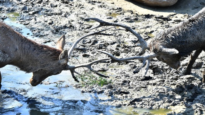 İzmir Büyükşehir Belediyesi Doğal Yaşam Parkı’nda yaşayan geyik ailesinde "liderlik mücadelesi" başladı. 5 erkek, 8 dişi ve 5 yavru olmak üzere toplam 18 geyiğin yaşadığı parkın ziyaretçileri, erkek geyikler arasında son günlerde sıkça yaşanan "boynuz düellolarına" tanıklık ediyor. Bu düelloların nedeni ise en güçlü, en sağlıklı ve en dayanıklı erkeğin belirlenmesi... Çünkü dişiler, tıpkı yaban hayattaki gibi yavrularının babasının güçlü ve sağlıklı olmasını istiyor.