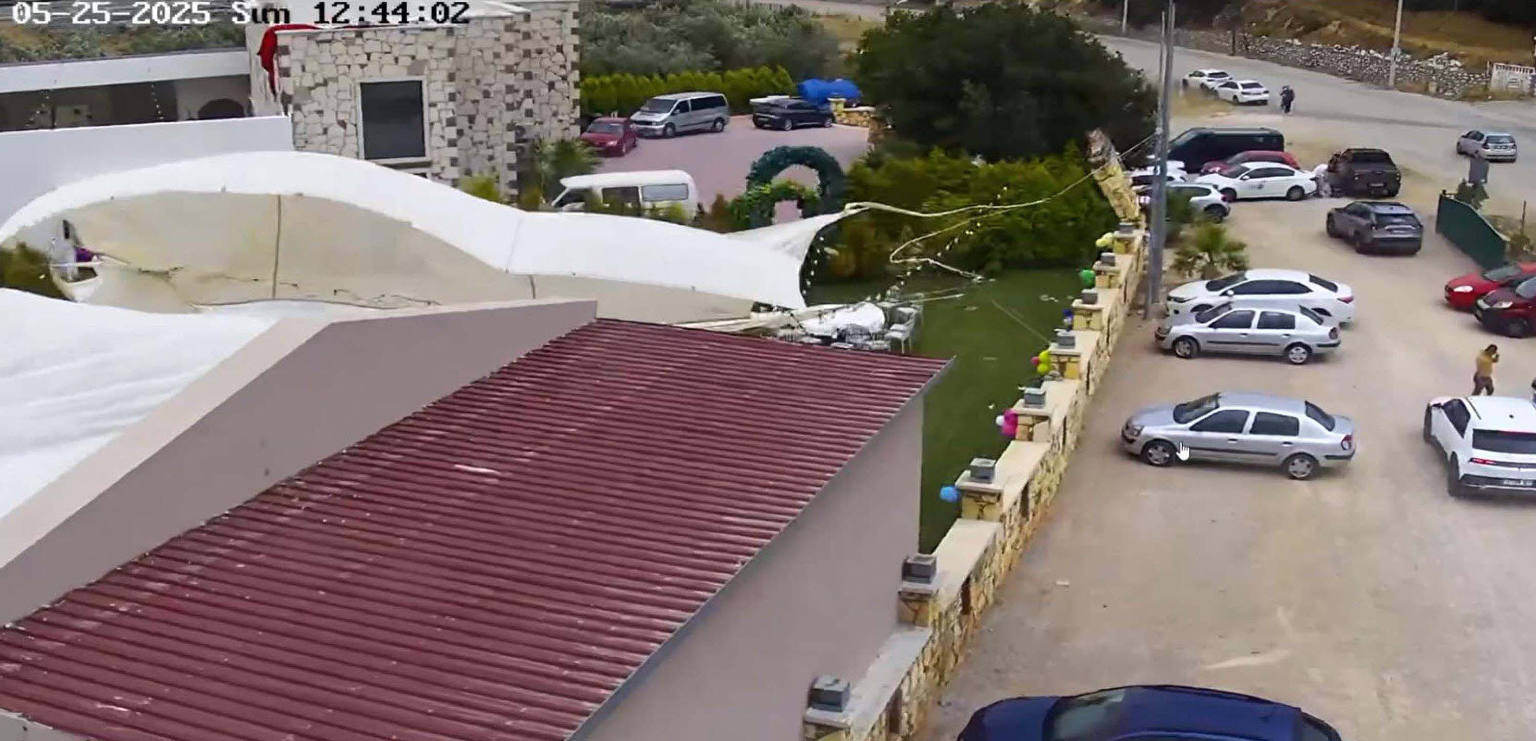 Görüntülerde; Baltacı çiftinin birçok ailenin geçtiği dekoratif kemerin altından geçerken kemerin rüzgarın etkisiyle devrildiği anlar, farklı açılardaki kameralar tarafından kaydedildi. (DHA)