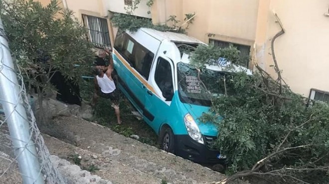 Alınan bilgiye göre, F.P. yönetimindeki 35 M 9396 plakalı minibüs, Asarlık mevkisi 343 Sokak'ta sürücüsünün direksiyon hakimiyetini kaybetmesi sonucu yol kenarındaki 4 katlı bir apartmanın bahçesine devrildi.