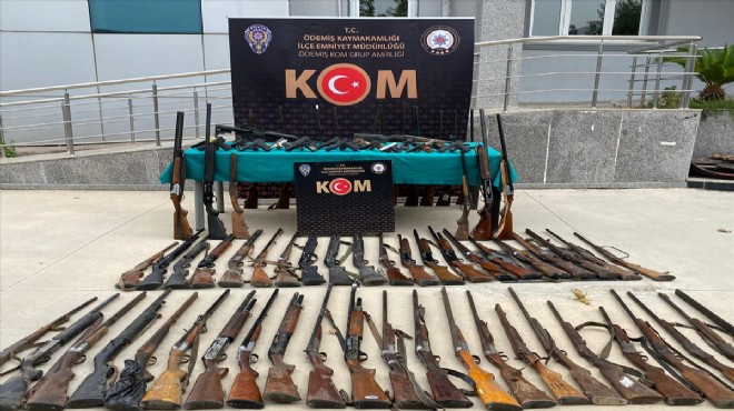 İzmir'in Ödemiş ilçesinde ruhsatsız 62 tüfek ile kuru sıkıdan bozma ve ruhsatsız tabancalar ele geçirildi.