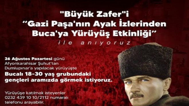 26 Ağustos Pazartesi günü Afyonkarahisar Şuhut’tan Dumlupınar’a kadarki güzergâhta “Gazi Paşa’nın Ayak İzlerinden Buca’ya Yürüyüş Etkinliği” düzenleyeceklerini açıklayan Buca Belediye Başkanı Görkem Duman, “Bu tarihi anı tekrar yaşamak ve atalarımızı anmak için Bucalı gençleri aramızda görmek istiyoruz” dedi.