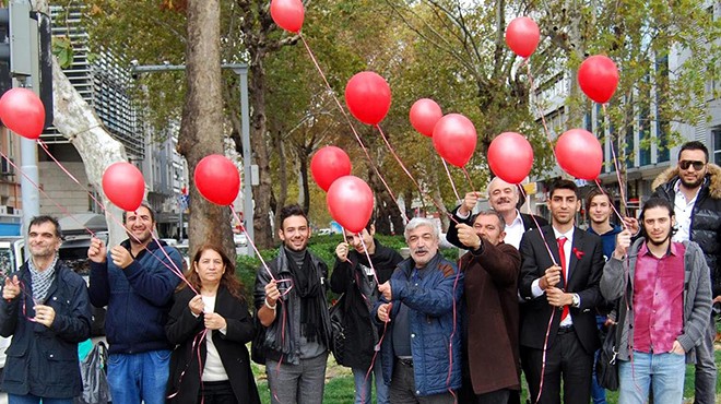 Etkinlik kapsamında, seminere katılanlar Basmane Meydanı'nda kırmızı balon uçurdu. (DHA)