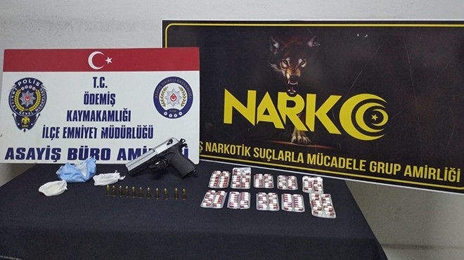İlçe girişinde denetim noktası oluşturan ekipler, durdurduğu bir araçta yaptığı aramada kurusıkıdan dönüştürülmüş tabanca ve bu silaha ait 11 fişek ile 138 adet sentetik ecza ve 28 gram metamfetamin ele geçirdi, Y.U. (36) ve E.K. (26) gözaltına alındı.