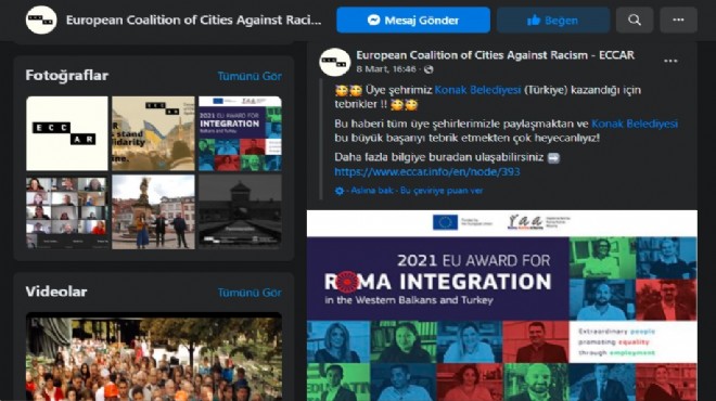 ECCAR’ın paylaşımında şu ifadelere yer verildi: “Konak Belediyesi'ni tebrik ediyoruz! Konak, bu önemli konuda çok motive oldu ve Roman karşıtlığı üzerine bir ECCAR çalışma grubu başlattı. Kısa süre sonra çalışmalarına başlayacak bu çalışma grubu için ECCAR ofisi ve Konak sıkı temas halinde!”