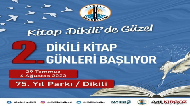 Dikili Belediyesi'nin 'Kitap Dikili'de Güzel' sloganıyla Yayıncılar Kooperatifi (YAYKOOP) iş birliğiyle düzenleyeceği 2'nci Dikili Kitap Günleri, açılış için gün sayıyor. Dikili 75. Yıl Parkı'nda yapılacak Kitap Günleri, 29 Temmuz'da başlayacak. Etkinlikte 9 gün boyunca çok sayıda yayınevinin stant açacak. Türkiye'nin tanınmış sanatçılarının, yazarlarının ve siyaset insanlarının katılacağı söyleşi ve imza günleri yapılacak. Dikili'de yaşayan şair ve yazarlar kitaplarını imzalayacak. Türk sinemasının değerli sanatçısı, oyuncu, senarist, yönetmen ve yazar Türkan Şoray'ın onur konuğu olarak katılacağı 2. Dikili Kitap Günleri'nde Ahmet Ümit, Ataol Behramoğlu, Çiğdem Toker, Kadri Gürsel, Barış Pehlivan, Barış Terkoğlu, Murat Ağırel, Timur Soykan gibi sanat, edebiyat ve basın çevresinde önemli yere sahip olan pek çok isim hayran ve okurlarıyla bir araya gelecek. Türk siyasetinin önemli isimleri düşüncelerini paylaşacak.