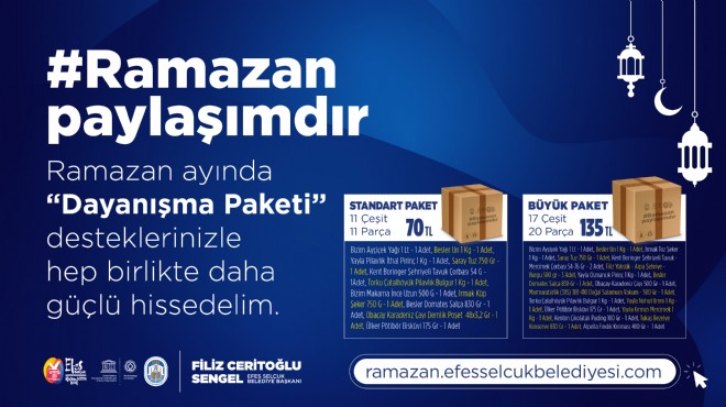 Destekte bulunmak isteyen yurttaşlar, ramazan.efesselcukbelediyesi.com adresinden iki farklı dayanışma paketinden istedikleri miktarda satın alabilecek. Satı alınan dayanışma paketleri, Efes Selçuk Belediyesi tarafından ihtiyaç sahiplerine ulaştırılacak.