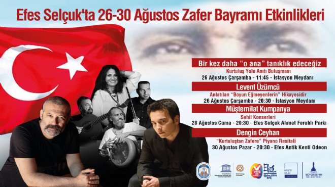 Büyük Taarruzun 98. Yıl dönümü sebebiyle Efes Selçuk’ta bir gelenek haline gelen Kurtuluş Yolu Anıtı önünde düzenlenecek törenin yanı sıra, Tiyatro ve Sinema Oyuncusu Levent Üzümcü, Müştemilat Kumpanya, Piyanist Dengin Ceyhan Zafer Haftası etkinlikleri kapsamında Efes Selçuk’lular ile bulaşacak.