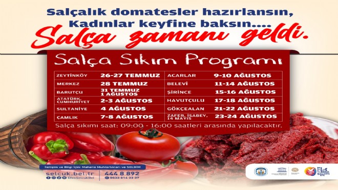 Efes Selçuk Belediyesi, kentte yaşayan kadınların hayatını kolaylaştırmak için bu yaz da salça makinasını kent merkezi ve köylere götürüyor. “Salçalık domatesler hazırlansın. Kadınlar keyfine baksın” sloganıyla Efes Selçuk Belediyesi’nin geleneksel uygulamalarından biri olan salça makinası 26 Temmuz’dan itibaren köylerde ve kent merkezinde yer alan mahallelerde olacak.