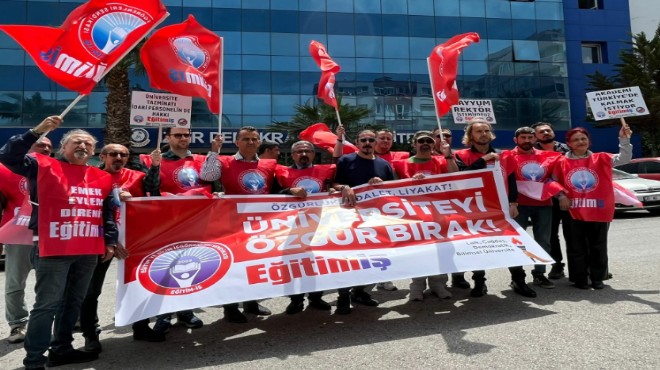 Eğitim-İş İzmir 4 No'lu Şube, İzmir Demokrasi Üniversitesi önünde toplandı. 'Üniversiteyi Özgür Bırak' yazılı pankartı açan Eğitim İş Üyeleri, “Özgür özel demokratik üniversite”, “Akademi Türkiye’de kalmak istiyor”, “Torpil değil hak edilmiş gelecek”, Kayyum rektör istemiyoruz” ve “Mobbing insanlık suçudur” sloganları attı.