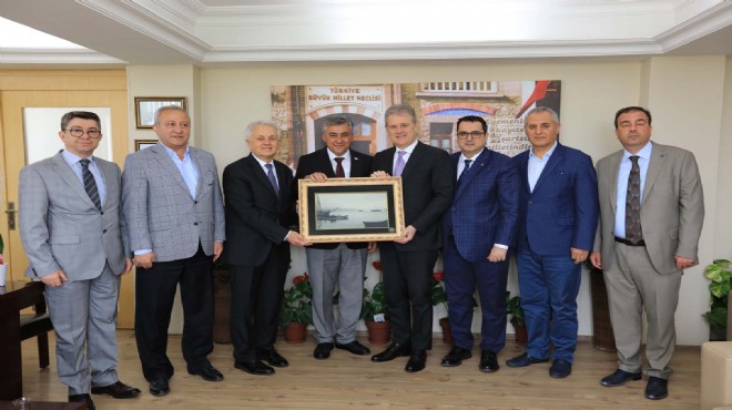 Ziyaret ardından İZTO Başkanı Özgener Başkan Mustafa İnce’ye Güzelbahçe fotoğrafı hediye etti.