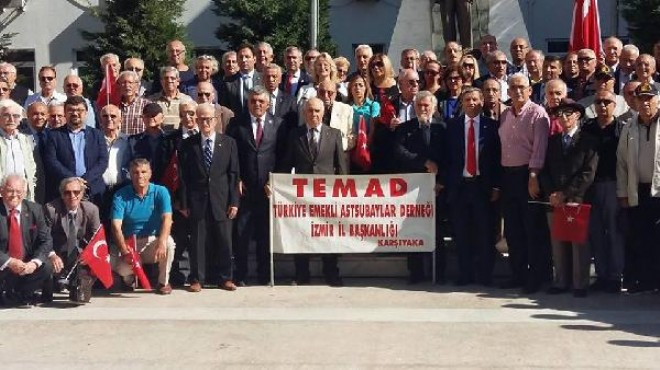 Emekli Astsubaylar Derneği İzmir Şubesi Başkanı Hüseyin Akbaş, yaptığı konuşmada astsubayların ülkenin birlik ve beraberliği için canları pahasına mücadele verdiğini belirterek "Astsubaylar başta terör örgütleriyle mücadele olmak üzere ülke savunmasında hep ön sıralardadır. Bu mücadelede şehitler verdik, gazi olduk. Atatürk Cumhuriyeti'nin korunması için aynı inançla, taviz vermeden mücadelemizi sürdüreceğiz. Ancak astsubaylar günümüzde özlük haklarındaki adaletsizlik nedeniyle sıkıntılar yaşamaktadır. Mesleğe başlarken 9/1. kademe yerine diğer memurlar gibi 9/2. kademeden başlamaları mutlaka sağlanmalıdır. Bir kısım temsil, görev, makam, komutanlık, kadrosuzluk gibi tazminatlar alırken aynı şartlarda mücadele eden astsubaylar mağdur edilmektedir. Bu adaletsizliğin düzeltilmesini, görev tazminatının verilmesini talep etmekteyiz" dedi. (DHA)