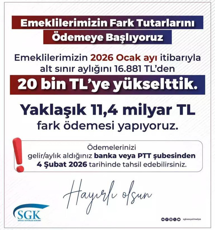 "Emeklilerimize ve hak sahiplerine fark tutarlarını ödüyoruz. Ödemelerinizi gelir/aylık aldığınız banka ve PTT şubesinden çekebilirsiniz. 4 Şubat 2026 tarihinde tahsil edebilirsiniz."