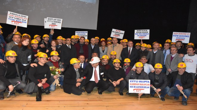 Manisa’nın Soma ilçesinde kömür madenlerinde çalışan EYT’lilerden bazıları ise baret taktı, üzerinde, ‘Somamız, kömürümüz, helvamız, ne olacak halimiz’ pankartları taşıdı. Yine, ‘Şair olduk, yazar olduk, bir tek emekli olamadık’, ‘Emekleri yok sayılan topluluk’ yazılı pankartlar taşındı. 'Edirne’den Kars’a, Jüpiter’den Mars’a', sloganına uygun olarak tasarlanan kostümler de yine katılımcılar tarafından giyildi. EYT’lilere CHP İzmir milletvekillerinden Kani Beko ile Atila Sertel’in yanı sıra İYİ Parti Genel Başkan Yardımcısı ve İzmir Milletvekili Aytun Çıray da destek verdi.