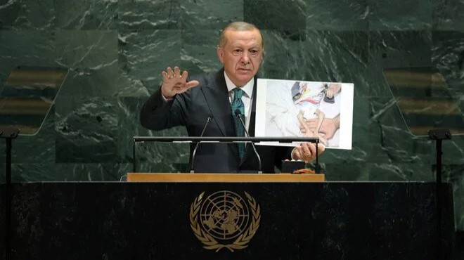 Hitabında, önceki yıllarda katıldığı toplantılarda olduğu gibi bu yıl da dünyanın dikkatini Gazze'de yaşanan soykırıma çeken Erdoğan, İsrail'in yaptığı soykırımı fotoğraflar ile belgeledi.