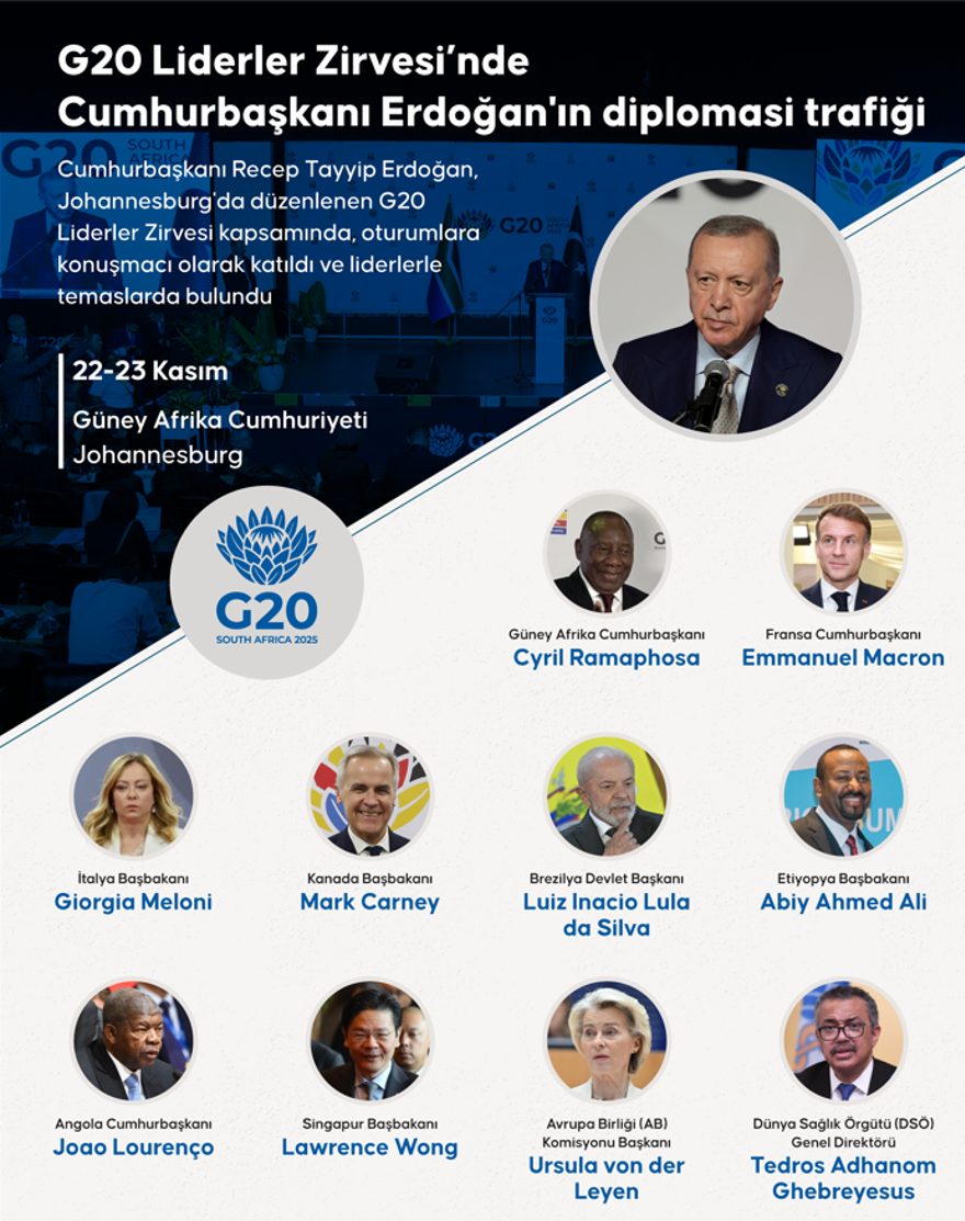 Cumhurbaşkanı Recep Tayyip Erdoğan, Johannesburg'da düzenlenen G20 Liderler Zirvesi kapsamında, oturumlara konuşmacı olarak katıldı ve ikili görüşmeler gerçekleştirdi.