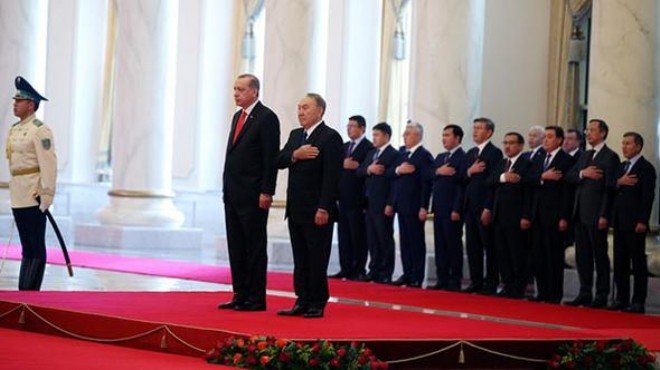 Cumhurbaşkanı Recep Tayyip Erdoğan, Kazakistan Cumhurbaşkanı Nursultan Nazarbayev tarafından resmi törenle karşılandı. Akorda Cumhurbaşkanlığı Sarayı'nda gerçekleşen karşılama töreninde Erdoğan ve Nazarbayev, heyetlerini birbirlerine takdim etti. Erdoğan ve Nazarbayev'in tören alanındaki yerlerini almaları sonrasında iki ülke milli marşları dinlendi. İki Cumhurbaşkanının tören kıtasını denetlemelerinin ardından baş başa görüşmeye geçildi.